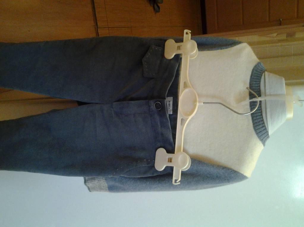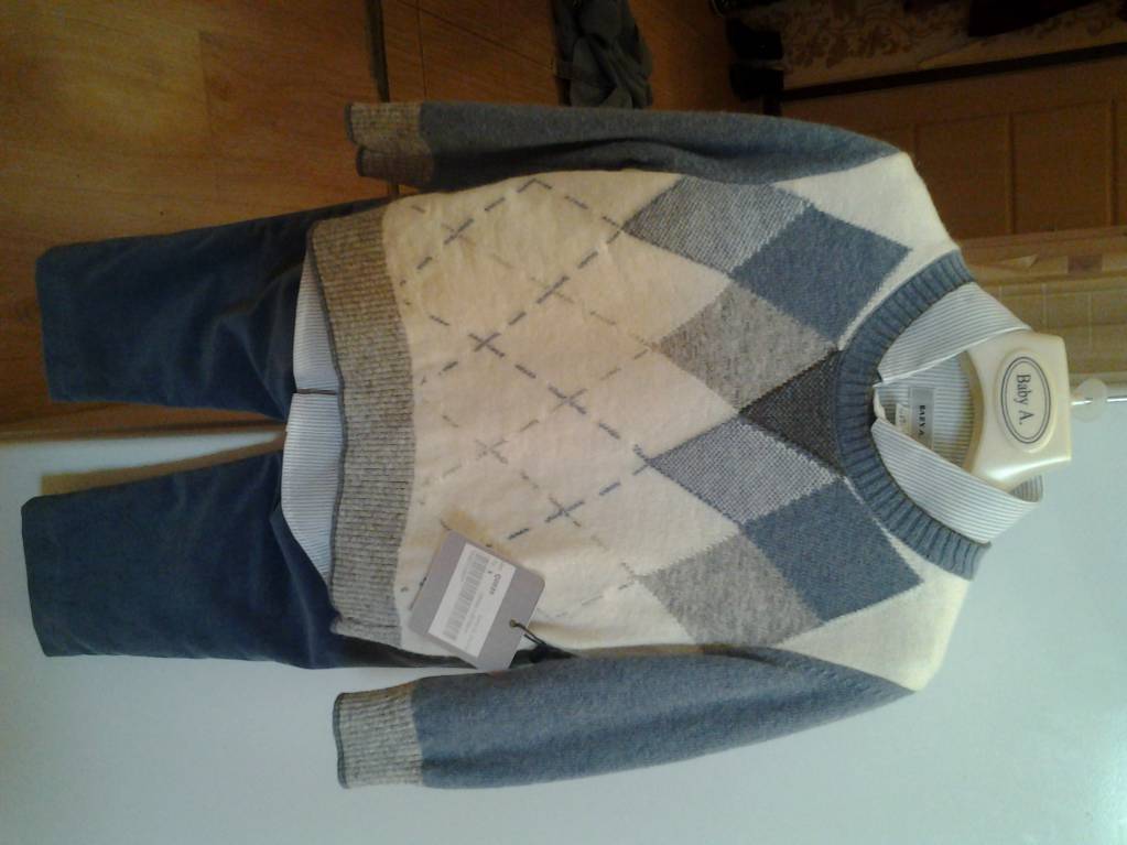 Продаю абсолютно новый костюм-тройку фирмы Baby A на мальчика на 18 месяцев. Оригинал, сделано в Италии. Имеется этикетка. Костюм состоит из рубашки белой в голубую полоску (хлопок), из брюк (внешняя часть вельвет, внутр.часть - хлопковая подкладка) и полувера (состав - шерсть мериноса, вискоза, кашемир, ангора). Подарили моему ребенку на 2 годика, соответственно он на него оказался мал. Возвращать подарок было неудобно, т.к. дарил начальник на работе.