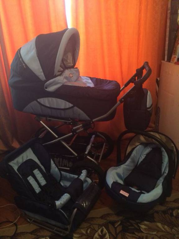 Пришло время нам прощаться с колясочкой. Цвет темно-синий с голубым.