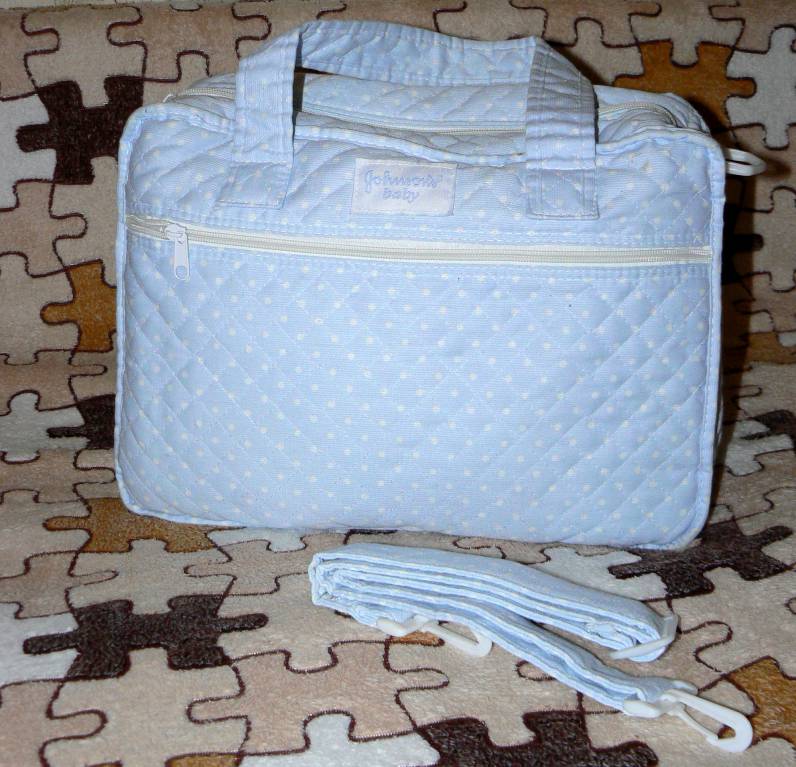 Сумка Johnson`s Baby (Джонсон*c Бэби) без Набора косметики Мамина сумка (голубая) Пристегивающийся ремень с регулируемой длиной позволит носить сумку на плече или повесить на ручку коляски. Благодаря внешним и внутренним карманам, Вы всегда сможете взять с собой запасную одежду и любимые игрушки малыша, а в боковом кармане очень удобно хранить детскую бутылочку. Там хитрая конструкция на молнии, в которую входит расстегивающаяся непромокаемая пеленка на которой можно перепеленать ребенка. Также в сумке удобно хранить все бутылочки-памперсы-игрушки, которые необходимы при прогулках. состояние новой мало б/у! размер пеленки 68*68 см, пеленка отстегивается полностью. размер 37*27*14 см (ширина*высота*глубина) (сумка без набора косметики!!!) -450р